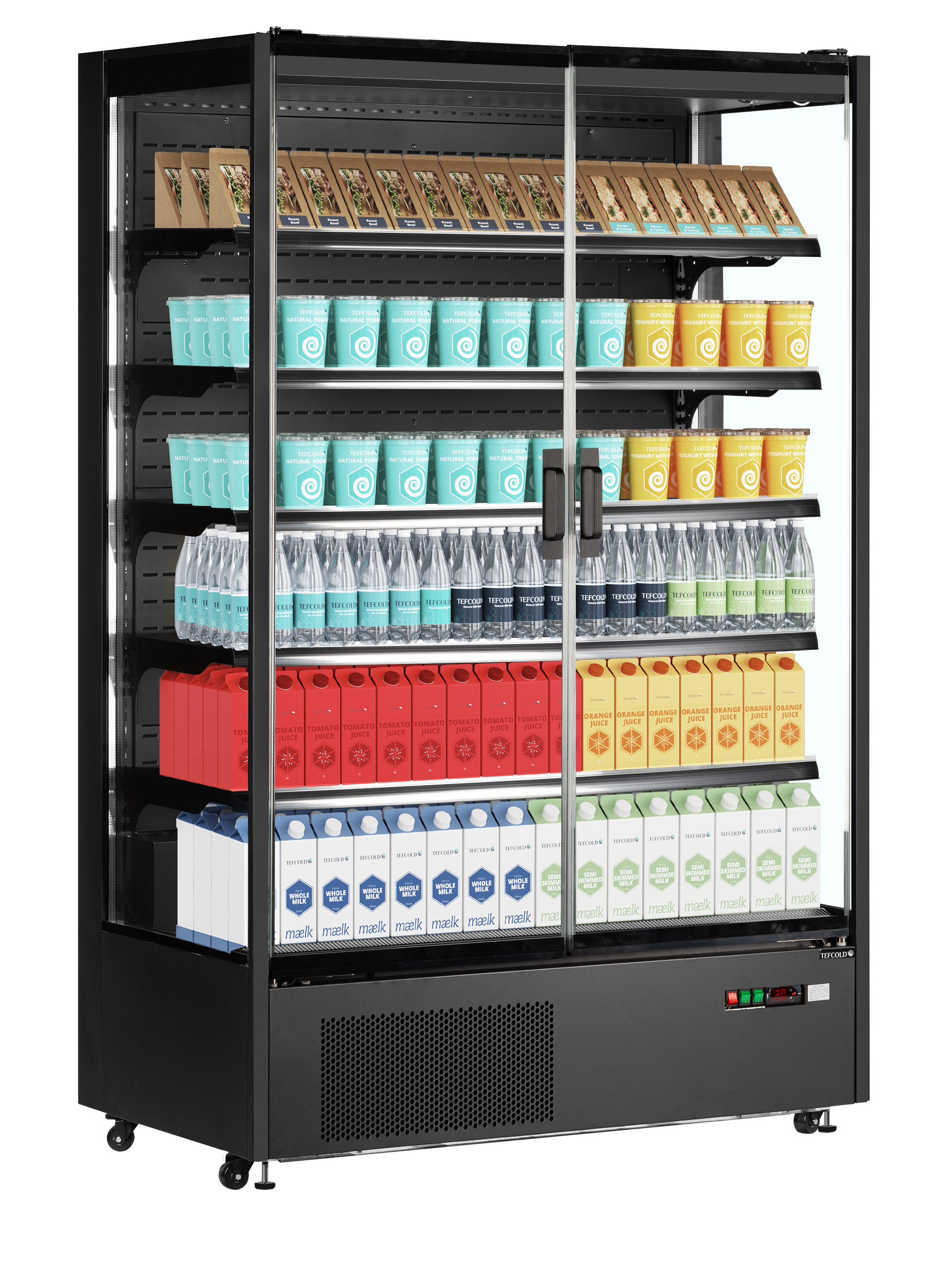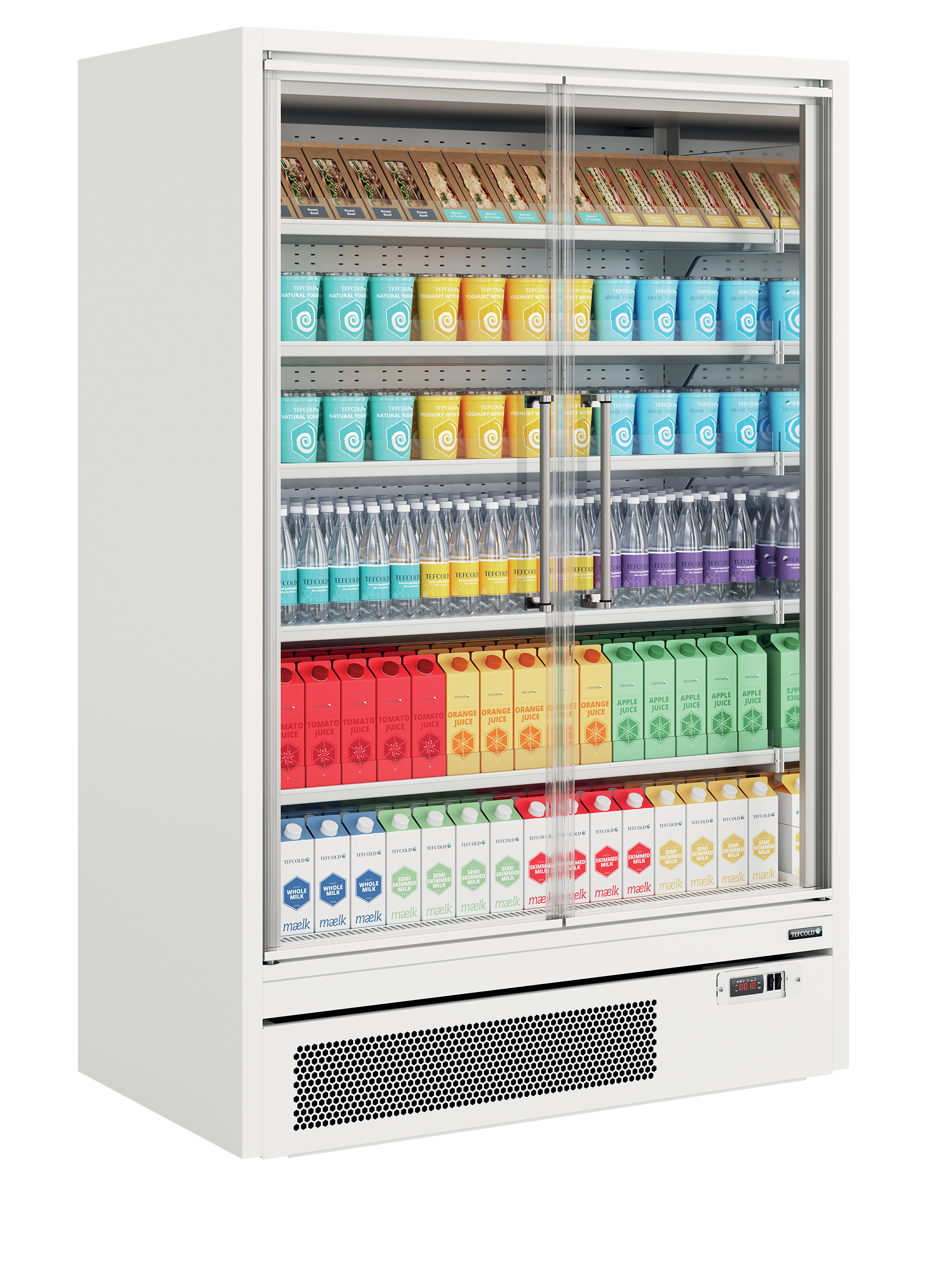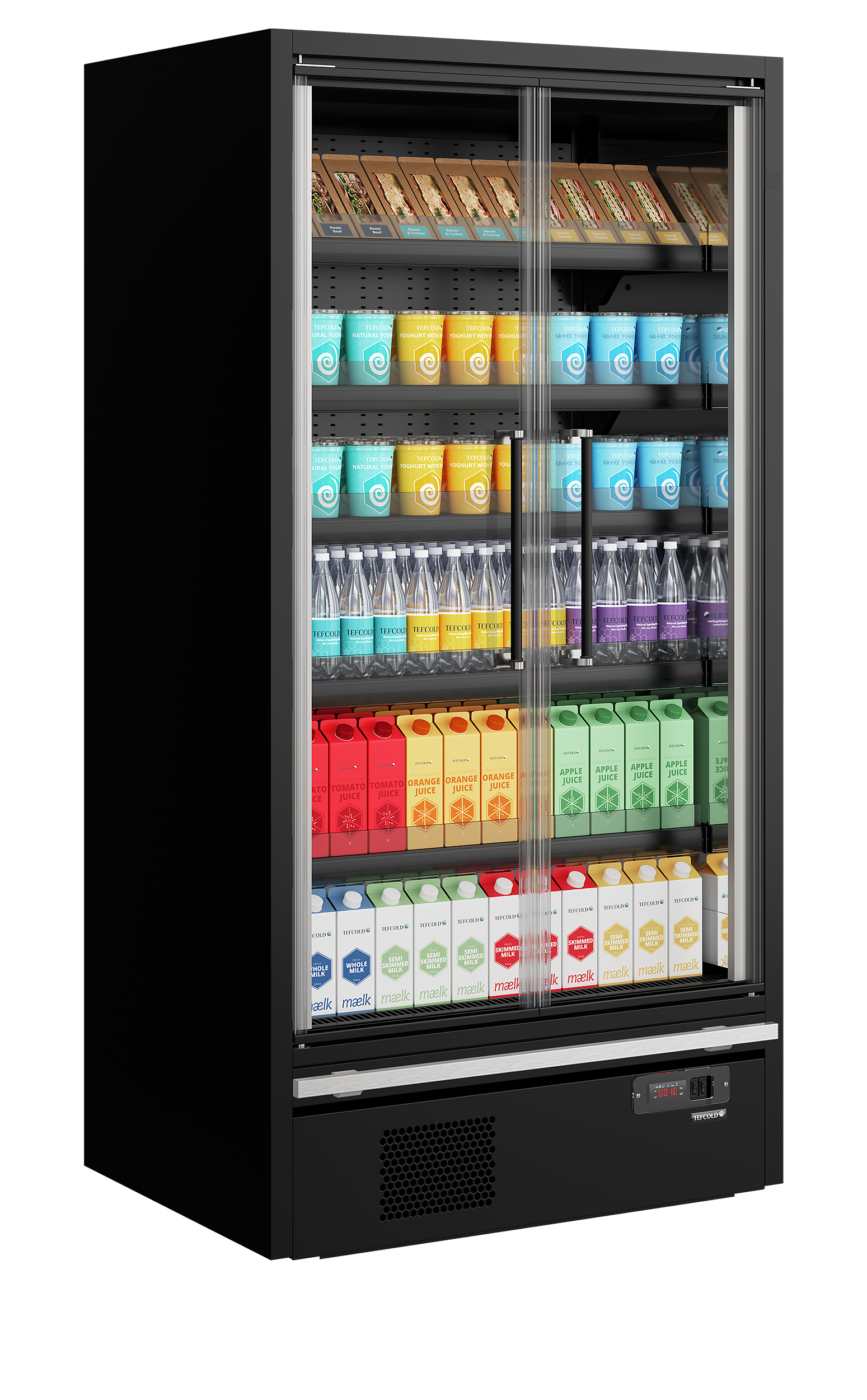 The TEFCOLD Galaxy+ range, finished in mirror stainless steel: our latest innovation in plug-in multidecks. We’ve combined an expanded display area and optimised cabinet efficiency. The ultra-low front and slim top canopy provide an extra 100mm of internal height, accommodating up to 5 shelves (plus base) as standard, all while maintaining an overall height of just 2040mm. With a depth of only 740mm, the unit fits through standard doors for easy installation, yet has 400mm deep shelves for maximum stock capacity. Each unit comes with heavy-duty adjustable shelves that can be tilted if needed, as well as EPOS ticket strips and shelf risers as standard. Optional extras include glass end-walls and multiplexing kits.