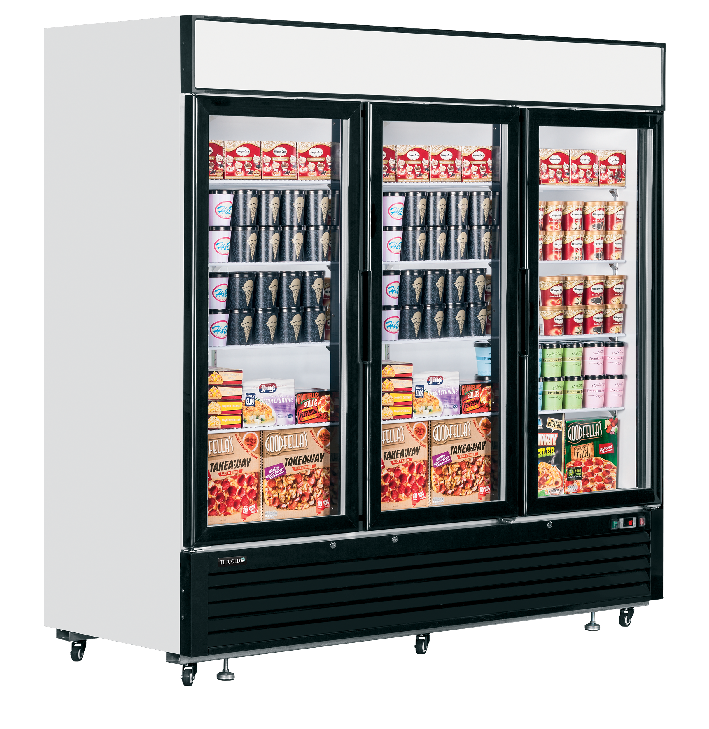 The Prodis XD380N is a single door full height display freezer with illuminated merchandising canopy. The unit features 5 static shelves, external temperature display, adjustable thermostat, fan assisted cooling and manual defrost.