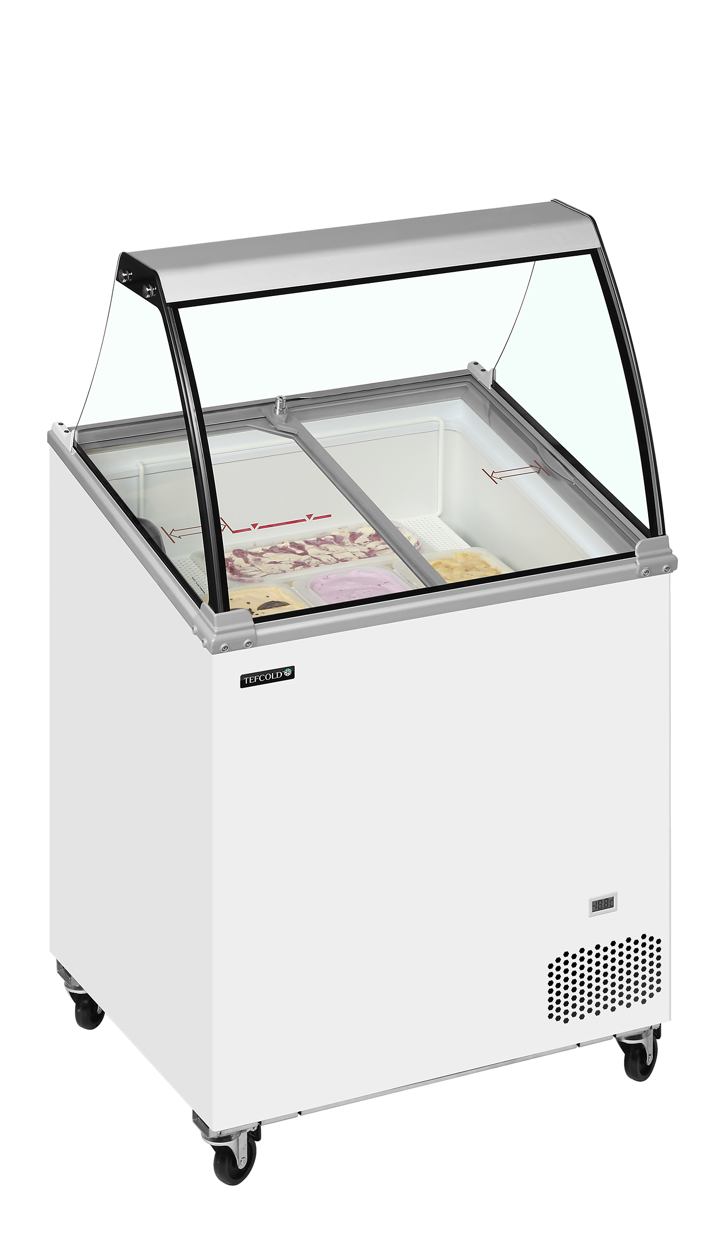 The IC201SCE + CANOPY features a curved glass canopy and angled sliding lids with locks for optimal product visibility and security. Perfect for branding, it offers storage under baskets, a digital thermometer, and castors with brakes for easy mobility. With a climate class 5 rating, it excels in high performance even in warm environments. Say goodbye to stainless Napoli pans – this unit accepts plastic Napoli size tubs.