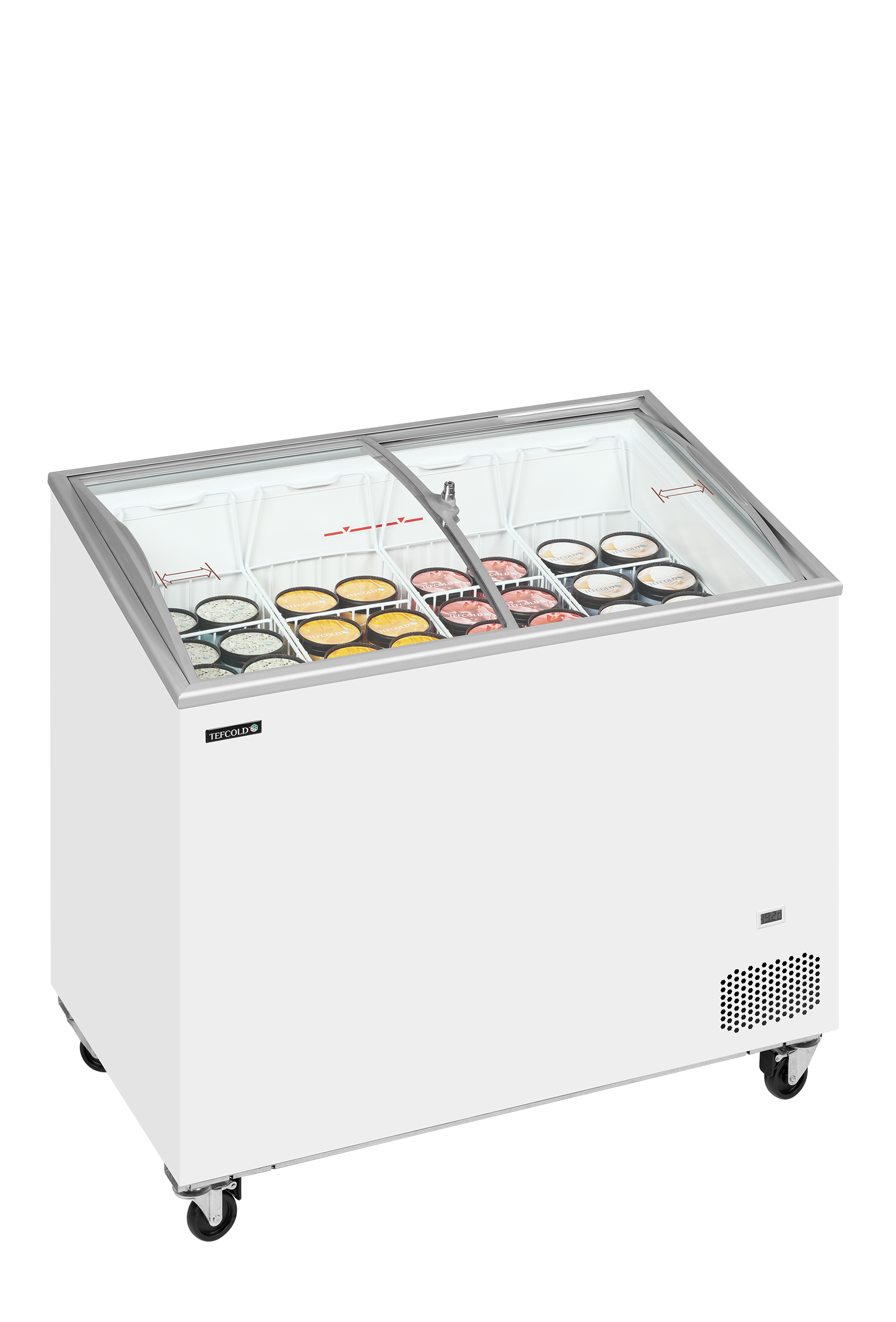 An excellent choice of sliding glass lid chest freezers, similar to the IC-SC range but with a sloping top for a better visual display and curved lids which always look better. Ideal for display of frozen food including ice cream and lollies. Sturdy heavy duty castors are fitted to enable easy movement of the cabinet, two of the four castors are lockable. Excellent adjustment of the temperature means you can hold a temperature around -14°C, ready to serve ice cream, or down to -24°C for other frozen food. The unit comes with a lock as standard and a defrost drain for easy cleaning. The unit also has a fan assisted condenser for efficient operation. A full set of baskets with dividers supplied as standard (except IC101SCEB which does not come with dividers). A firm favourite with many ice cream companies. (A glass canopy version for scooping ice cream is also available).