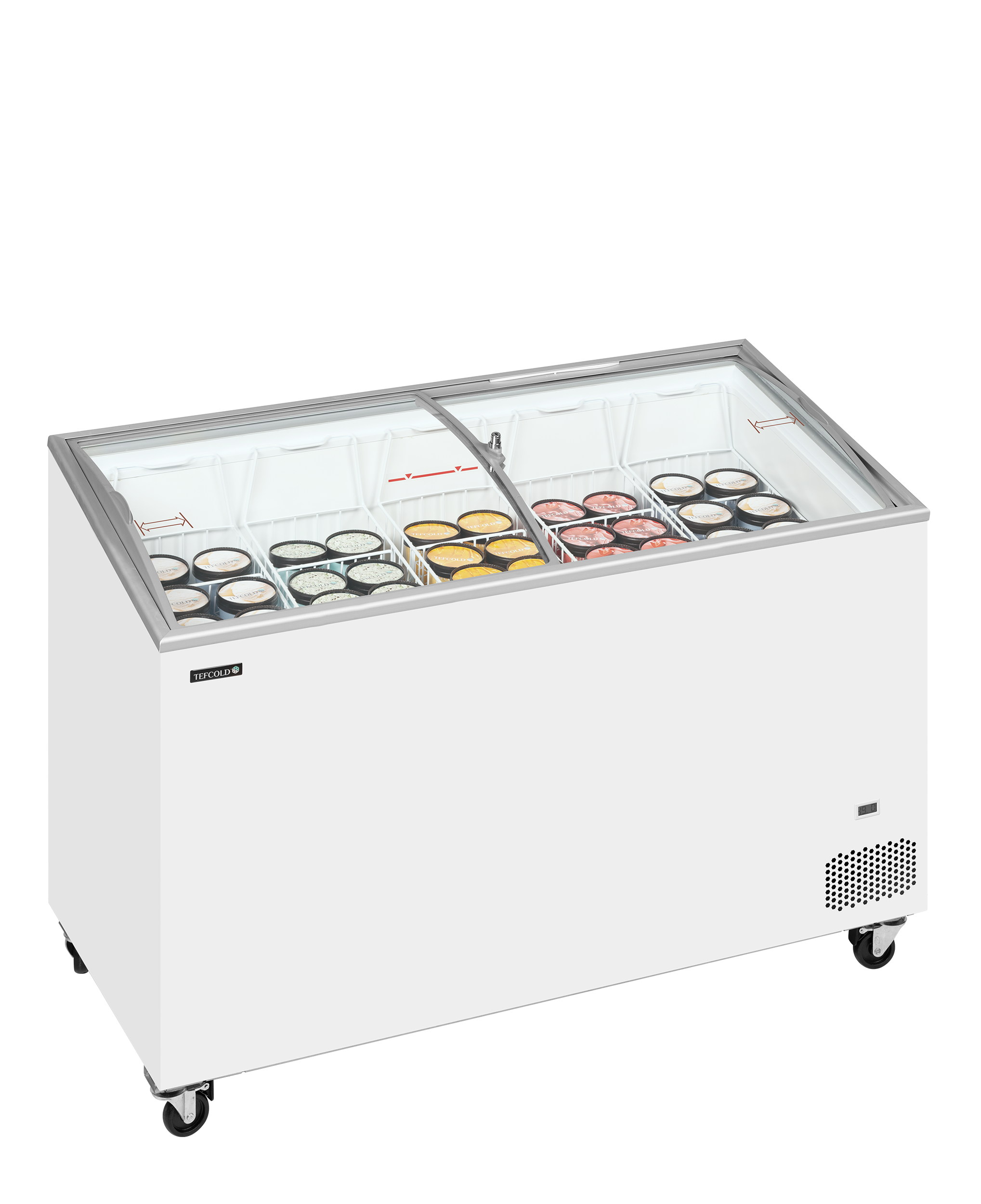 An excellent choice of sliding glass lid chest freezers, similar to the IC-SC range but with a sloping top for a better visual display and curved lids which always look better. Ideal for display of frozen food including ice cream and lollies. Sturdy heavy duty castors are fitted to enable easy movement of the cabinet, two of the four castors are lockable. Excellent adjustment of the temperature means you can hold a temperature around -14°C, ready to serve ice cream, or down to -24°C for other frozen food. The unit comes with a lock as standard and a defrost drain for easy cleaning. The unit also has a fan assisted condenser for efficient operation. A full set of baskets with dividers supplied as standard (except IC101SCEB which does not come with dividers). A firm favourite with many ice cream companies. (A glass canopy version for scooping ice cream is also available).